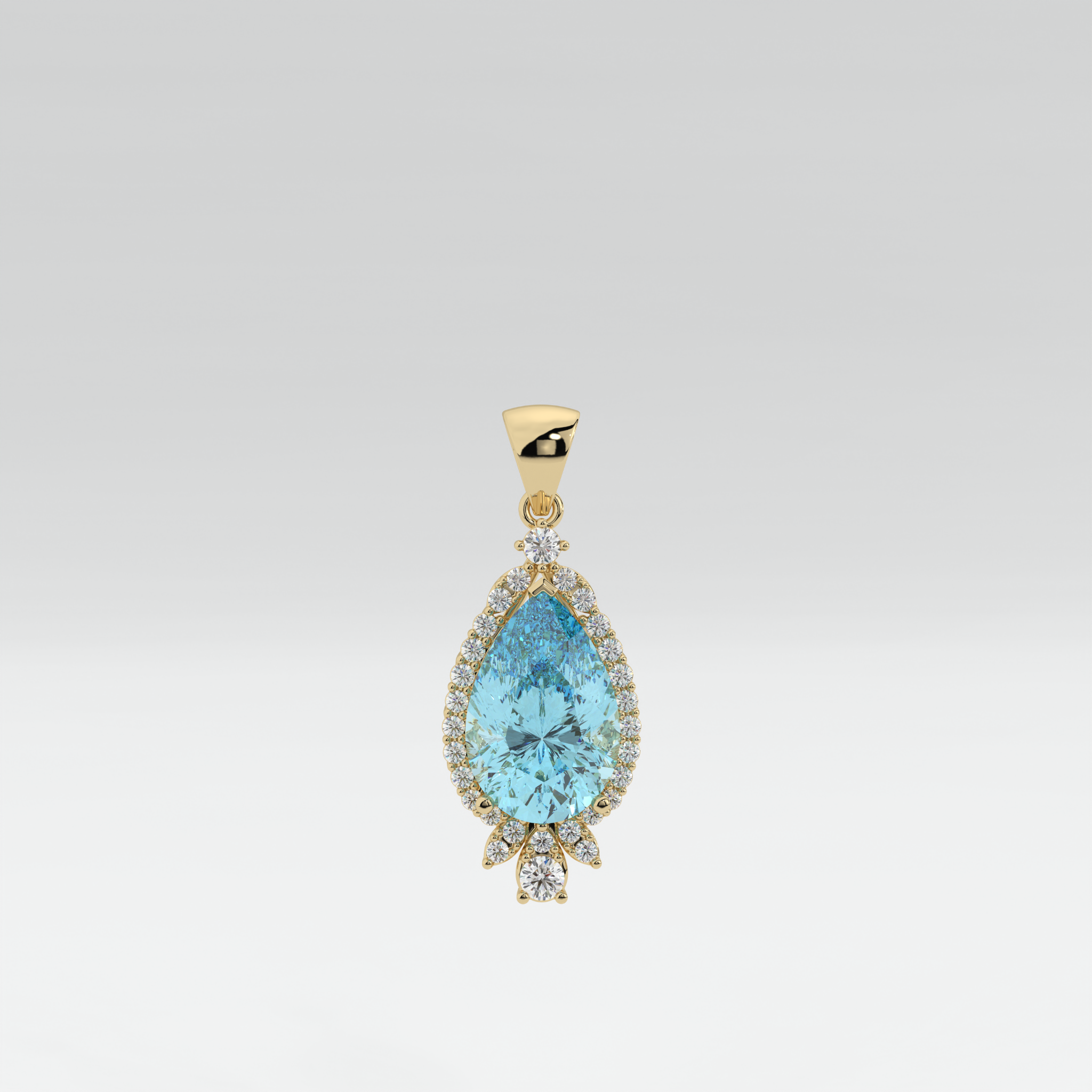 A refined expression of elegance, this pendant showcases a pear-shaped topaz framed by a delicate halo of brilliant diamonds. Designed with timeless proportion, the setting enhances the gemstone’s natural radiance while offering versatile wearability.